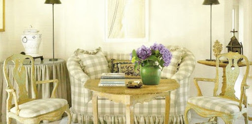 Have I told you yet just how fabulous their home is? Filled to overflowing with painted Swedish and French antiques, it is a vision in soft, muted colors. Gustavian furniture is a close cousin to French furniture and they mix well together. Plain and checked linens cover the peeling painted wood frames of the chairs and sofas. Walls throughout are painted white and the wood floors are just as light. No fussy drapery here, instead wood shutters cover the windows. Sprinkled throughout the house are pieces from the Wisteria catalogue, but mostly the accessories are one-of-kind antiques, some of which will serve as inspirations to copy for the catalogue. Veranda magazine is based out of the deep south and thus, isn't available everywhere, so for those unable to buy it, here are a few highlights from the Newsom house:
